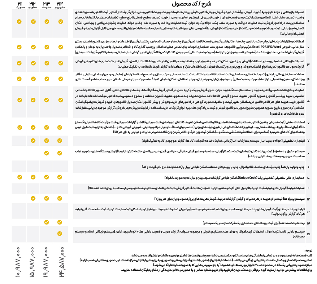 علاوه بر این، با توجه به نیازهای متنوع کسب‌وکارها، سطوح مختلفی برای هر یک از این سری‌ها تعریف شده است. این امکان به شما کمک می‌کند تا نرم افزار حسابداری شرکتی و خدماتی مناسب با نیازهای خود را انتخاب کنید و از پرداخت هزینه‌های اضافی جلوگیری نمایید.